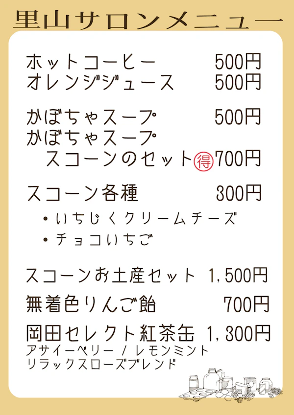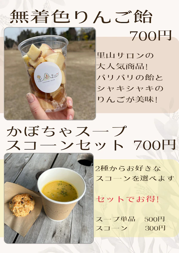 販売内容 | スコーン、りんご飴、スープ、ホットコーヒー |