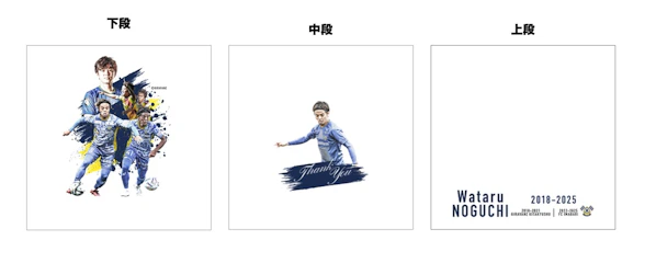 野口 航 選手の引退を記念して制作されたビジュアルを、3枚のアクリルにプリントし、レイヤーで表現することで奥行きと立体感のある特別なメモリアルアクリルスタンドに仕上がりました。