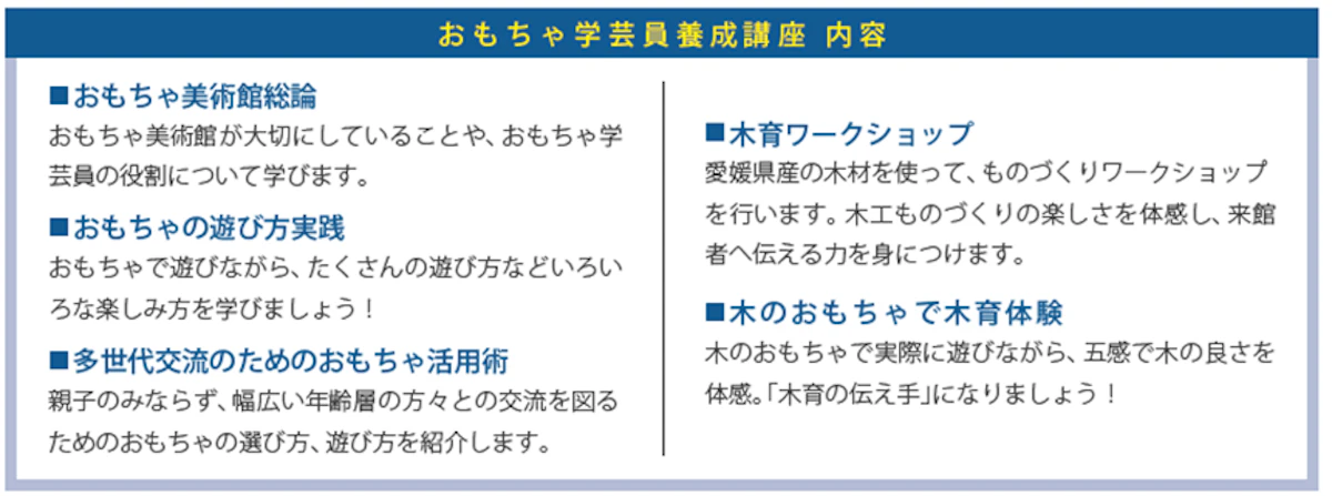 この度、2026年春にイオンモール今治新都市内に開館予定で、当社が運営参画する「しまなみ木のおもちゃ美術館」のおもちゃ学芸員(ボランティアスタッフ)養成講座を4月26日(土)、27日(日)に実施いたします。