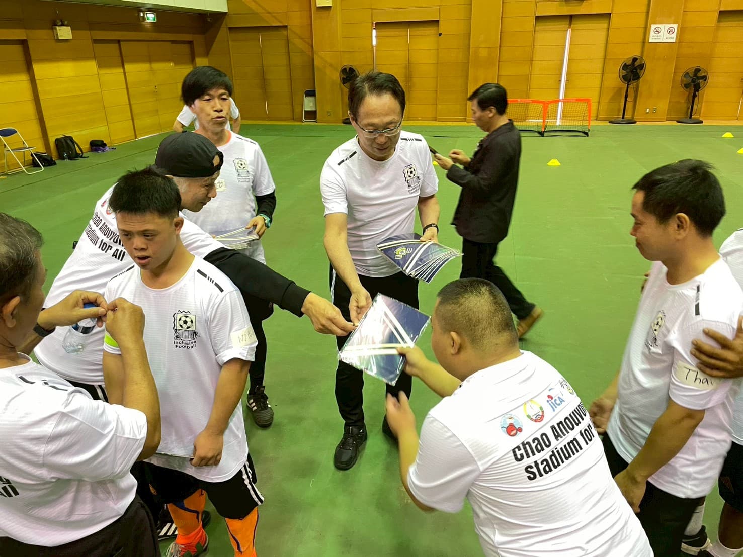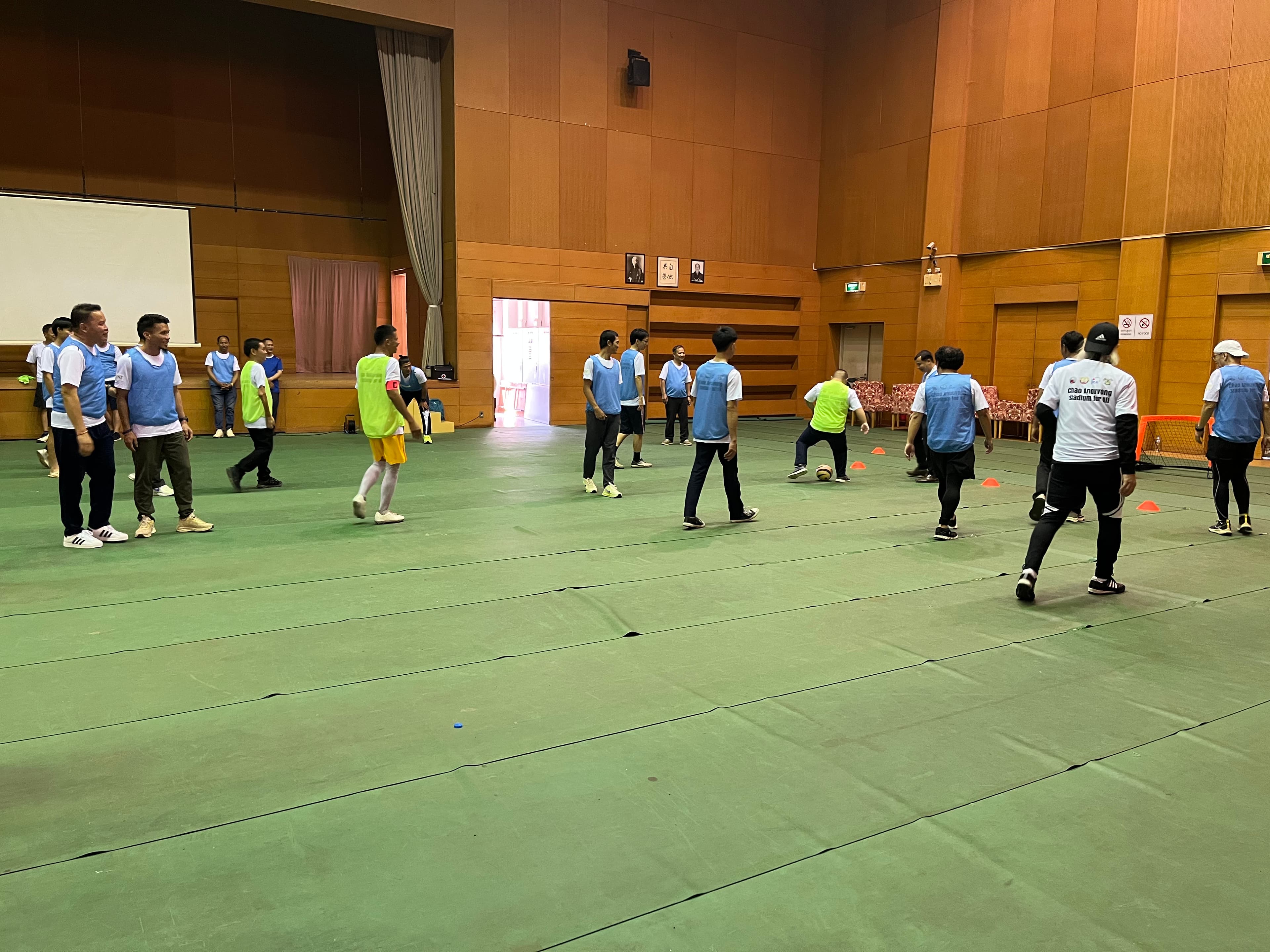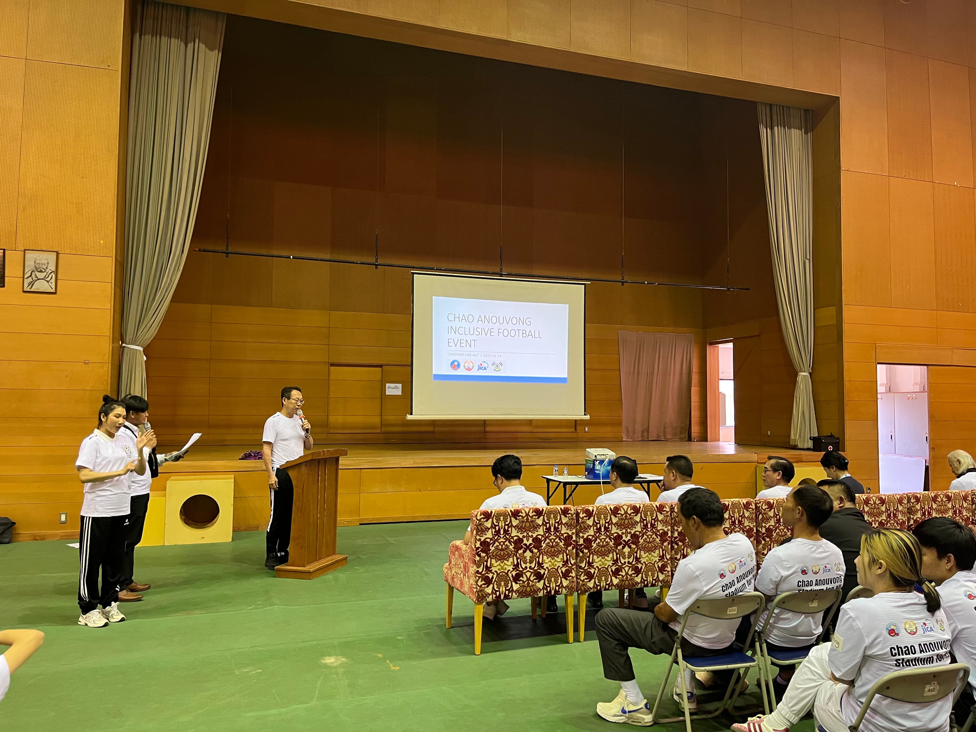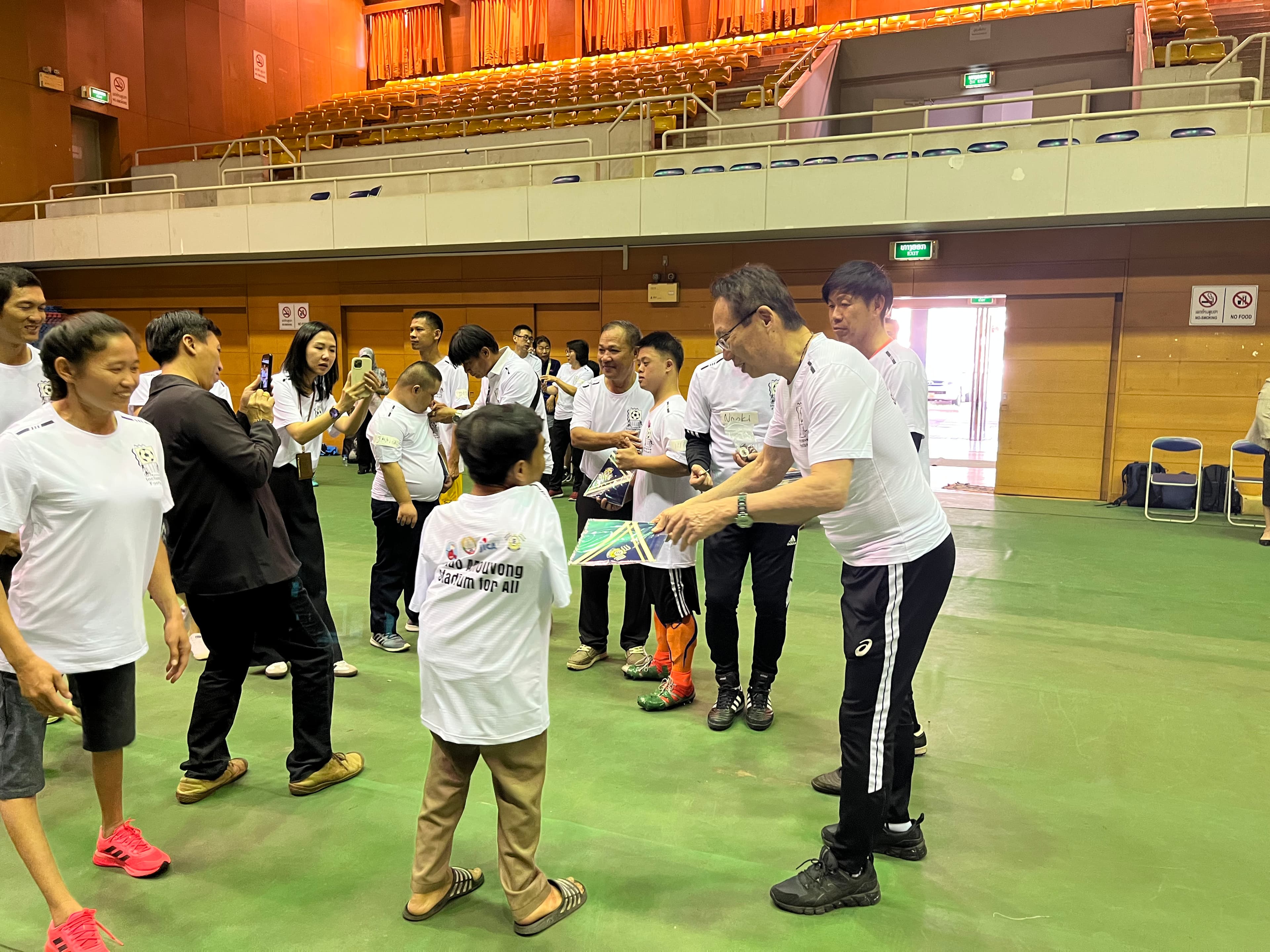午前中は、改修が進むチャオ・アヌウォン・スタジアムの横にある武道センターで、教育スポーツ省の職員、身体障がい者、ろう者、視覚がい者、知的障がい者、JICA職員、アジア障がい者活動を支援する会(ADDP)職員など多くの方々が集まったイベントに参加しました。イベント冒頭では会長の岡田がアシさとを拠点として目指している共助のコミュニティについて紹介させていただきました。イベントでは障がいの有無に関わらず多様な人が楽しめるウォーキングサッカーを実施し、参加者全員が一緒にスポーツを楽しむことができる貴重な体験となりました。