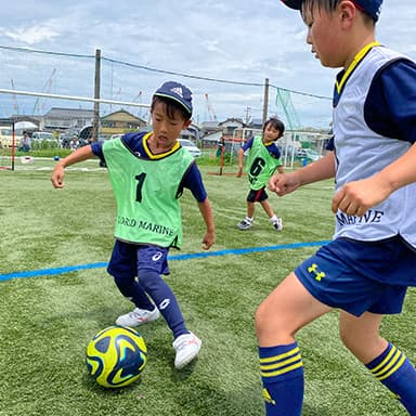 ボールを止める、蹴る、運ぶなどサッカーを楽しむために必要な技術を身に付けます。