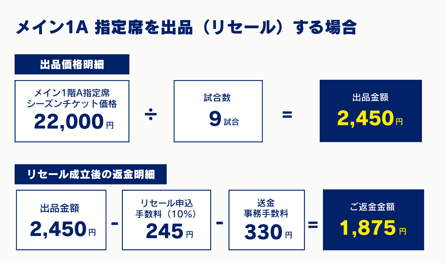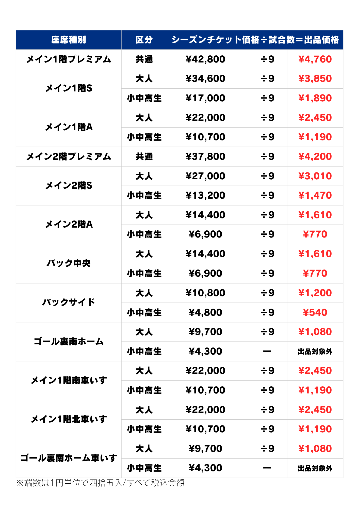 シーズンチケットの1試合あたり単価を目安に以下の固定価格(赤字部分で表記)での出品が可能です。